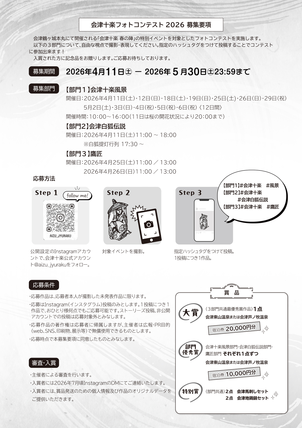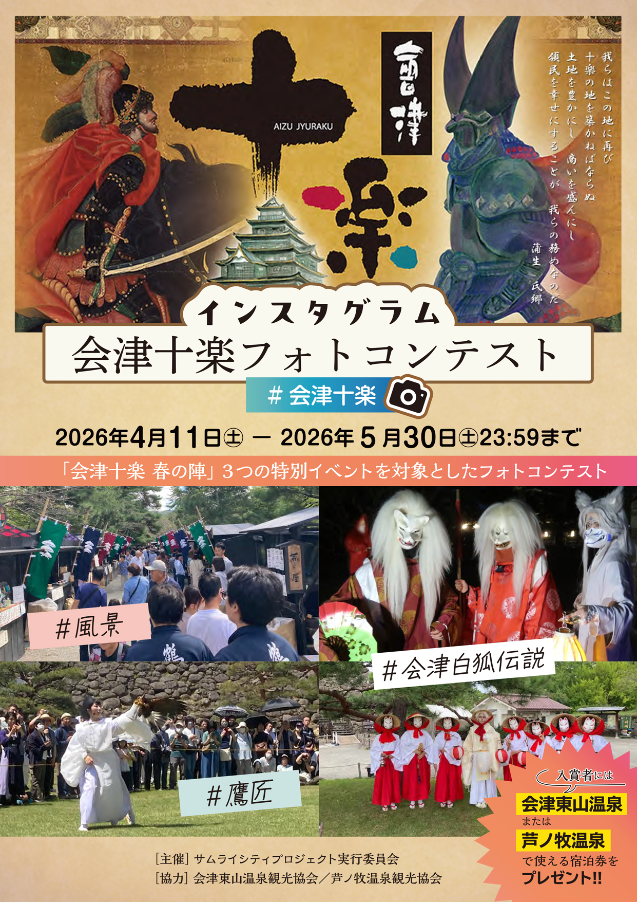 - 「會津十楽春の陣」3つの特別イベントを対象としたフォトコンテスト!入賞者には「会津東山温泉」または「芦ノ牧温泉」で使える宿泊券をプレゼント!
